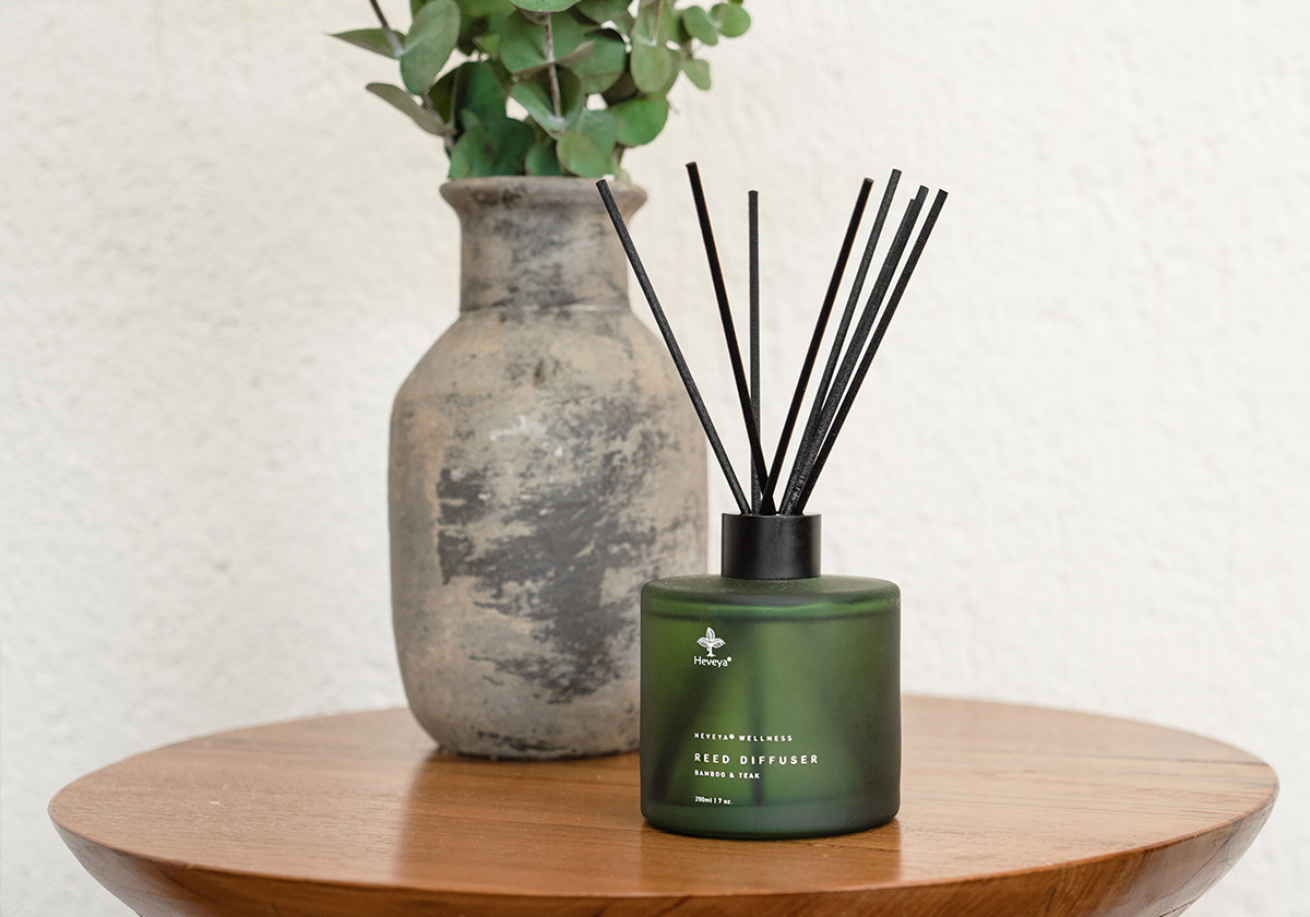 Reed sticks are immersed in our signature light and earthy Bamboo & Teak oil